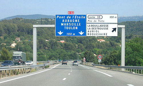 "Sortie" is French for exit, so it is exit No. 33, and straight on is Autoroute A52 to Marseille and Toulon.