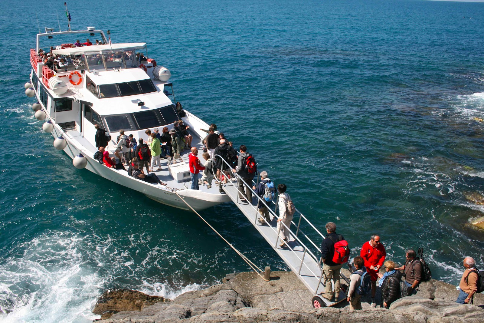 - Corniglia - the station area is fairly level but the town is located up on a bluff, so you'd have to use the small shuttle van to get there. The boat doesn't dock in Corniglia so no issues there.