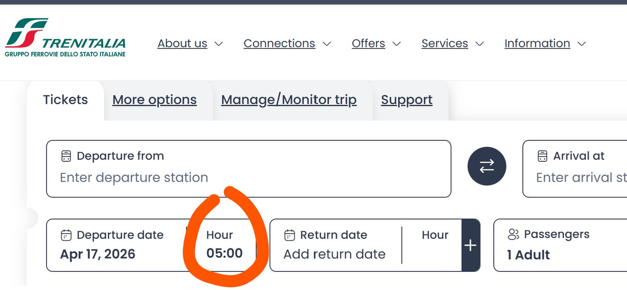 You should see these trains: https://i.postimg.cc/MTDW0Z03/Immagine-2026-04-17-134804.jpg As you can see I selected 5 AM and the site shows trains departing after.