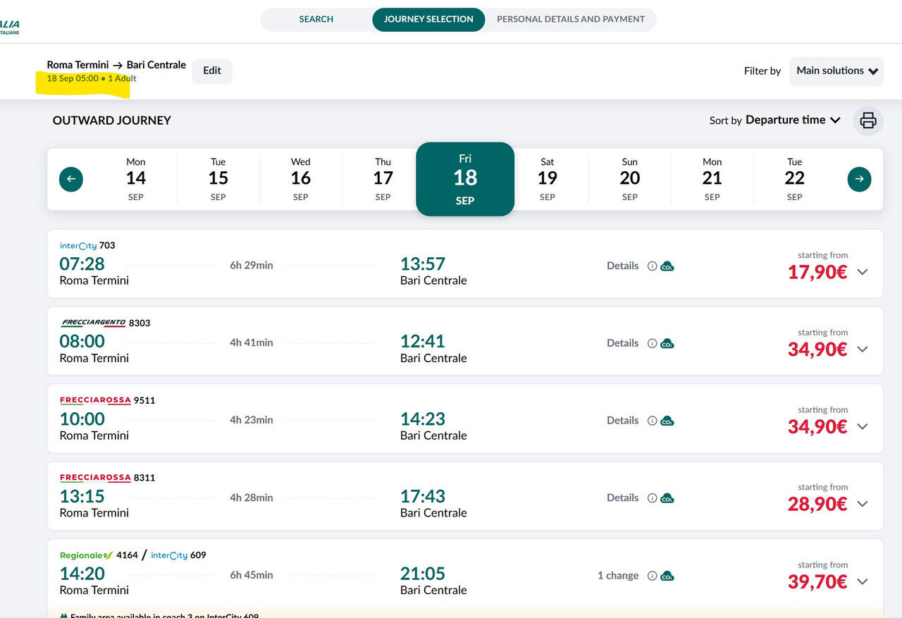 Simply pick an early time of travel from the drop down menu, it's next to the departure date box as shown here: https://i.postimg.cc/L64V3ySL/Immagine-2026-04-17-135428.jpg