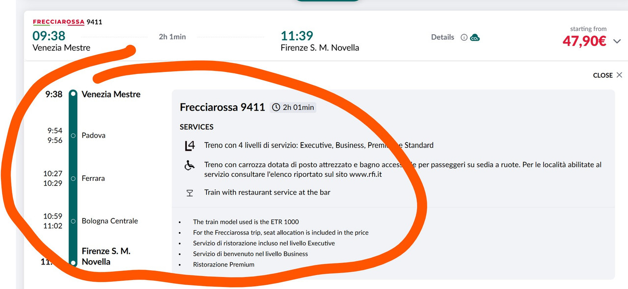 official app. When I check various dates and times, I easily find times to my liking. No problem so far. But when I select a particular train, I am finding a confusing fact. Here is what is happening. Once I click on a particular time and then click the little circled “I” (information) next to the time, up pots a different time, generally six hours earlier. This consistently happens, no matter the route, time or day, type of train, etc.